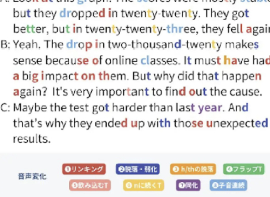 スクリプトは音声変化箇所に色付けされているため、聞き取りにくい発音も視覚的に分かりやすく、効率よく練習できます。