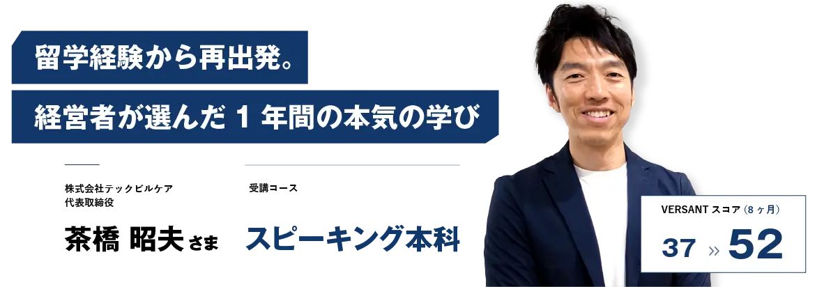 建築、防災、保守点検事業を営まれている茶橋様。海外展開を視野に入れ、トライズでスピーキング本科(12ヶ月)を受講されました。