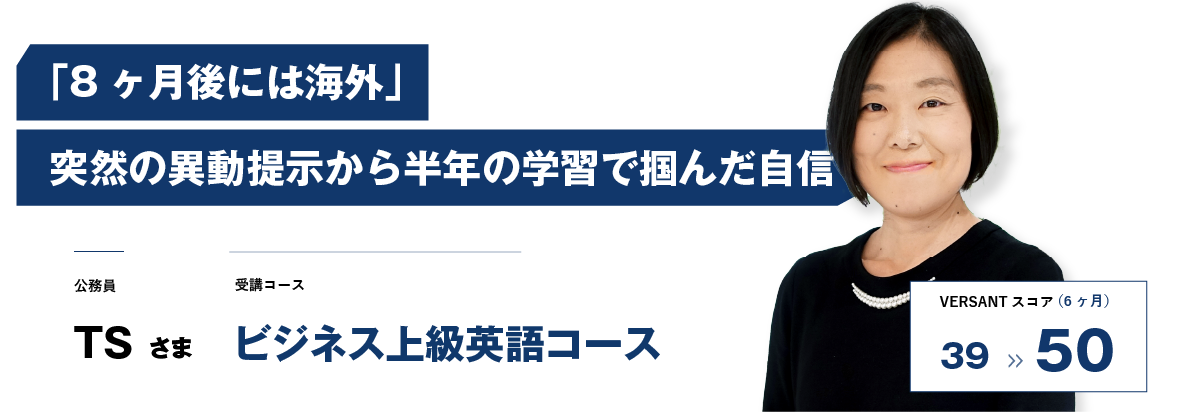 初の海外赴任が決定し、6ヶ月という限られた受講期間で実践的な英語力習得に挑んだTSさま。家庭と仕事を両立しながら、トライズでの学習を通じて確かな成長を実感されました。
