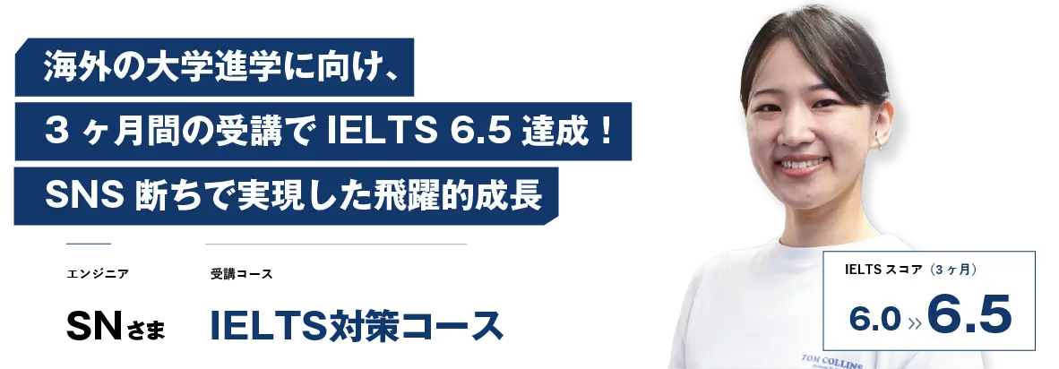 海外の大学進学を目指し英語学習を開始されたSN様。トライズでの3ヶ月間の学習を経て、目標のIELTS 6.5を達成されました。独学やオンライン英会話で伸び悩んだ経験も含め、学習の軌跡について伺いました。